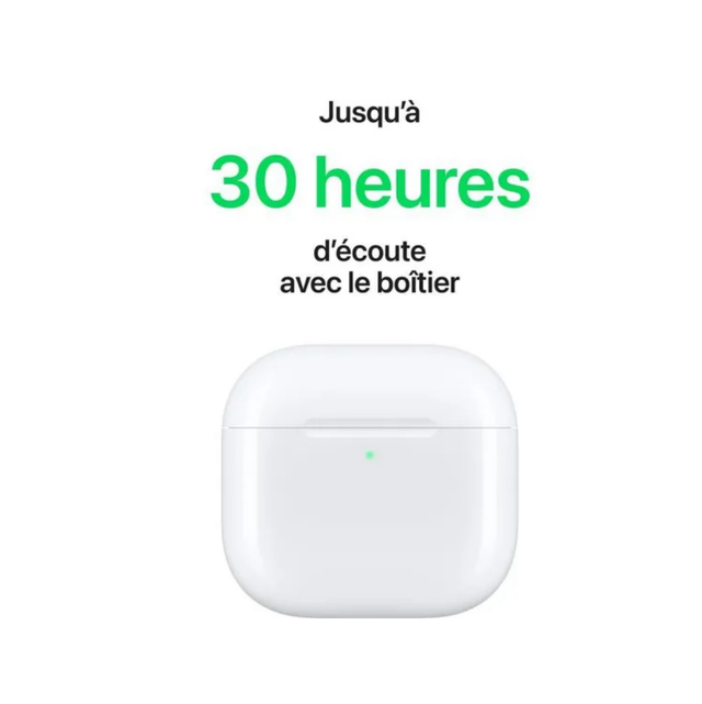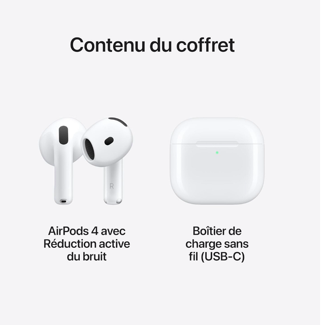 Autonomie (jusqu'à) : AirPods 4 avec Réduction active du bruit : Jusqu’à 4 heures d’écoute sur une seule charge avec la Réduction active du bruit activée. Jusqu’à 5 heures d’écoute sur une seule charge avec le contrôle du bruit désactivé.