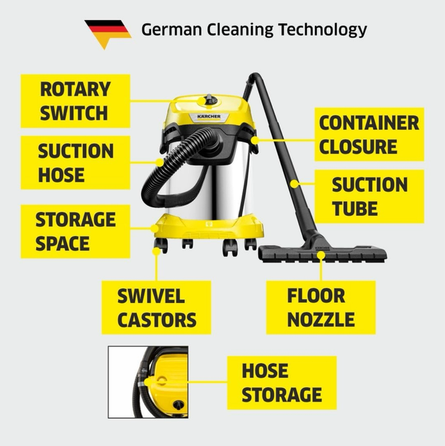 - Design pratique : l'aspirateur WD 3 dispose d'une cuve en acier inoxydable de 17 litres, d'un flexible d'aspiration de 2 mètres et de possibilités de rangement pour accessoires, cble et flexible