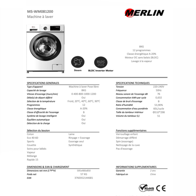 Simplifiez votre quotidien avec la Machine à laver Merlin MS-WM081200. Conçue pour allier performance, économie et praticité, elle propose 12 programmes de lavage, dont un cycle rapide de 15 minutes, pour répondre à tous vos besoins.